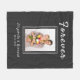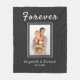 Este conservador personalizado preservará sus recuerdos y los mantendrá calientes al mismo tiempo. Este diseño se puede personalizar con tu imagen, nombres y fecha favoritos. El texto del título muestra actualmente la palabra "Forever" en un tipo de letra manuscrita, pero este texto se puede modificar en el menú Edición si lo desea. La tipografía blanca está fijada tanto en un popular tipo de letra San Serif (la fecha) como en un elegante tipo de letra de guión y colocada en un sutil patrón de rayas negras y grises. El patrón será más visible cuando se amplíe al tamaño de la manta.