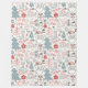 Esta manta de lana de Navidades adorables presenta un divertido y caprichoso patrón de ilustraciones Santa, árboles y regalos en rosa, rojo y verde azulado.