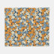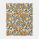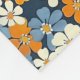 Un patrón floral vibrante cubre toda la imagen. Las flores, pequeñas y estilizadas, en tonos naranja, azul claro y blanco roto, están densamente dispuestas sobre un fondo azul marino. Las flores tienen un aspecto ligeramente imperfecto, de aspecto pintoresco, con variaciones en la saturación de color y en la forma que le dan al patrón un aspecto texturado, casi pintado a mano. El patrón repetido crea un efecto visual alegre y ocupado.