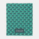 Una manta personalizada perfecta para su mascota, diseñada con un patrón repetitivo con un tierno doggy sonriente con orejas disquetas y un hueso de perro. Fondo verde.