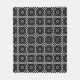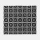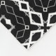 Sobre una base negra con un patrón geométrico blanco y plateado