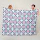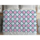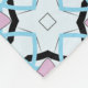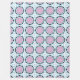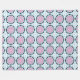 Toallas con un patrón circular rosa sobre un fondo geométrico azul cuelgan de un perchero. Abajo, una toallita a juego está doblada sobre una superficie neutra.