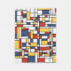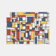 Arte de neoplasticismo con líneas negrita negras y cuadrados y rectángulos rojos, amarillos y azules.