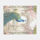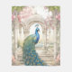 Elegante arte acuático con un hermoso pavo real con arcos indios al fondo con flores rosas.