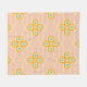 Hexagonal floral pattern with blue-green centers and orange outlines on a peach background. White lines connect the shapes, creating a geometric grid.