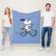 Pedal into cozy comfort and classic charm with this adorable blue fleece blanket, featuring Snoopy and Woodstock on a bicycle! This soft and warm blanket showcases a delightful line-art illustration of Snoopy, wearing sunglasses, happily riding a vintage-style blue bicycle with Woodstock perched safely behind him. The dashed lines behind the back wheel suggest motion, adding to the playful scene, all set against a cheerful light blue background. This iconic and heartwarming design brings a sense of nostalgic joy and timeless appeal. Perfect for snuggling on the couch, picnics, or just celebrating the enduring friendship of Snoopy and Woodstock, this blanket is a must-have for any Peanuts fan!