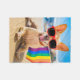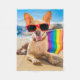 Esta linda foto muestra a un perro chihuahua en la playa llevando una bandera del Orgullo Gay coloreada con arcoiris.