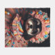 La imagen muestra un lindo perro negro en el centro, adornado con un vibrante vestido de cuentas. El atuendo del perro presenta un marcado contraste contra el fondo completamente negro de la imagen, haciendo que el colorido disfraz destaque aún más. Dado el oscuro trasfondo, la atención del espectador se dirige inmediatamente hacia el perro disfrazado.