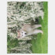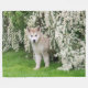 Un joven cachorro malamute de Alaska con un abrigo doble de felpa parado en un prado de hierba con un arbusto blanco florido en primavera. Una linda foto de perro tomada por Katho Menden, esta manta de lana es un regalo para los amantes del perro y de las mascotas.