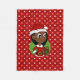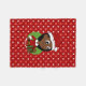 Diseño con ilustracion de un lindo sonriente feliz chica afroamericano de pelo negro, el chica está usando un disfraz de Santa Cláusula con gorra rojo y sosteniendo un regalo