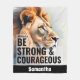 león majestuoso con una expresión serena y poderosa, rodeado de una brillante luz dorada. El fondo es un gradiente suave de tonos cálidos de tierra, simbolizando fuerza y fe. Superponer la imagen es un inspirador verso de la Biblia escrito en elegante letra de guión, como 'Sé fuerte y valiente Joshua 1:9. personalizar con nombre