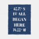 Una hermosa manera de recordar dónde comenzó todo personalizando este diseño con sus propias coordenadas. Busque sus coordenadas en un sitio de asignación y simplemente personalizar el texto, la latitud y los números de longitud para crear su propio diseño personalizado. Un cálido color azul marino en el fondo, lo que lo convierte en un lugar ideal para cualquier tipo de decoración.