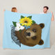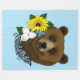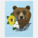 Un retrato de oso marrón con flores y una pluma de arte tribal en el fondo de un azul brillante
