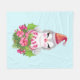 Una manta con un diseño tierno y caprichoso con un adorable pingüino vestido con un sombrero rojo de santa. Detrás de un ramo de flores con caramelos de rayas rosas y blancas.