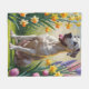Un perro alegre se sienta tranquilamente sobre la exuberante hierba verde, rodeado de coloridas flores primaverales bajo un suave cielo azul. Esta pintura al óleo digital captura un momento sereno con pinceles expresivos, colores cálidos y un sentido de suavidad.