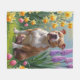 Un perro alegre se sienta tranquilamente sobre la exuberante hierba verde, rodeado de coloridas flores primaverales bajo un suave cielo azul. Esta pintura al óleo digital captura un momento sereno con pinceles expresivos, colores cálidos y un sentido de suavidad.