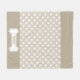 Esta manta de lana tiene un patrón de huellas de pata de perro blanco en un color de fondo beige. La parte superior e inferior tienen bordes beige más oscuros. En la parte inferior también hay una silueta de hueso de perro blanco con un área de texto de personalizable para un nombre.