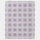 "Two images featuring a towel and washcloth with a repeating geometric floral pattern in purple and black. The towel is displayed hanging on a rod, and the washcloth is laid flat with a corner folded. The pattern conveys an elegant, decorative tone."
