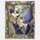 Hadas rubias vestidas de morado y rojo en un patrón geométrico floral de verde, ornamental, lavanda y rosa,