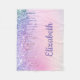 Una manta de lana fina con un purpurina de goteo de imitación arco iris sobre un fondo rosado. Personaliza con su nombre en escritura púrpura.