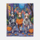 Los Adorables Rat Terriers vestidos con juguetones disfraces de Halloween llevan baldes de calabaza mientras truco o truco bajo el cielo iluminado por la luna. Este diseño festivo destaca el abrigo liso de la raza, las orejas perky y la personalidad enérgica, capturando a la perfección la atmósfera espeluznante y divertida de la noche de Halloween. Una alegre celebración para los amantes del perro y los hinchas de Halloween por igual.
