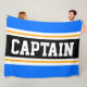 Este diseño deportivo, atlético, presenta texto en negrita CAPTAIN dentro de una banda ancha negra realzada con doble franjas de carreras blancas y amarillas contra rayas exteriores brillantes azules. El texto se puede personalizar.