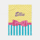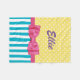 Una bonita y colorida manta de lana de color primavera con rayas turquesas y puntos de polka amarillos diseñados sólo para la muchacha con una personalidad brillante. El diseño de esta joya está adornado con una cinta rosa brillante atada a un elegante arco. Personalice agregando su nombre en moda morada. Imagen plana impresa, NO cinta real.