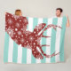 Una manta con ciervo rojo con forma de copo de nieve blanco sobre un fondo de rayas azules y blancas.