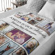 Una manta de ropa de cama conmemorativa personalizada con un simple fondo blanco que puede cambiarse a cualquier color, un collage de 16 fotos, el dicho "para siempre en nuestros corazones" y su nombre.