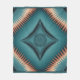 Diseño de patrones geométricos simétricos en formato cuadrado con un esquema de color verde azulado y de cobre. El centro cuenta con un gran medallón en forma de diamante con un trabajo intrincado en la línea y un patrón circular de ráfagas de sol en el interior. El medallón está rodeado por cuatro pequeños marcos en forma de diamante con motivos decorativos. El fondo tiene un efecto de ráfaga de sol radiante que emana del centro, creando un sentido dinámico de movimiento. El borde exterior está formado por picos de tipo aserrante, con matices de cobre, en tonos ojivales contra el fondo verde azulado. Todo el diseño está encerrado por una delgada línea de puntos. La paleta de colores pasa de verde azulado profundo en el centro a tonos turquesa más claros cerca de los bordes, con acentos de cobre en los picos y elementos decorativos. El patrón tiene una influencia de diseño nativa americana o suroeste con sus formas geométricas y sus motivos radiantes.