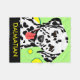 El arte colorido del perro que ofrecía al Dalmatian blanco con los puntos negros contra un fondo verde claro y los círculos amarillos, nombre de la raza imprimió en fondo negro