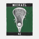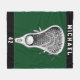Una manta creativa de lacrosse keepsake con un diseño lax de palo y bola sobre fondo verde. Editar texto para agregar el nombre del jugador lax y el número de equipo #.