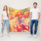 Esta manta de lana tiene un hermoso patrón abstracto en colores de naranja, amarillo, rosa, azul-verde y crema que recuerda al arte de la tinta alcohólica.
