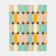 Retro geometric pattern with overlapping vertical ovals in shades of teal, peach, orange, and cream on a dark brown background. Vibrant and symmetrical.