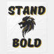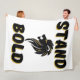 Esta manta de lana tiene un diseño que muestra las palabras "Stand Bold" en un tipo de letra negrita con letra negra sobre una sombra de color dorado con un ícono de cabeza de león negro y oro en el centro en este tema de cita de la biblia basado en la fe. Esta manta está hecha de una pulga de poliéster 100% suave y acogedora de carnicería con una impresión de sublimación de color vibrante de borde a borde y un punteo de doble borde con una máquina trasera de color blanquecino lavable.