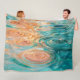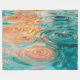 The image shows a close-up of water droplets creating ripples on a surface. The water is a mix of teal and orange hues, creating a visually appealing contrast. Several droplets are suspended mid-air, capturing the moment of impact. The ripples spread outwards in concentric circles, distorting the light and creating interesting patterns.