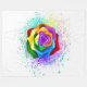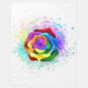 Rosa grande y floreciente con pétalos de arco iris sobre fondo blanco, pintado con salpicaduras de pintura colorida y brillante. 3.ª