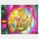 Una fascinante pintura digital de un rosa reventando con energía psicodélica y tonos arcoiris. Los pétalos rosados vivos se envuelven alrededor de un núcleo dorado brillante, creando una pieza central floral surrealista.