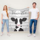 Una manta de lana que incluye tu monograma, nombre y un ilustracion de vaca. La manta tiene un fondo de madera gris y hojas decorativas. Simplemente personalizar el nombre y el monograma, añada la manta a su carrito y traiga esta manta caliente a casa.