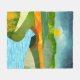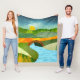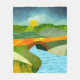 Resumen paisaje de un río bajo un puente de piedra con colinas onduladas y una carretera dorada en colores y texturas llamativas.