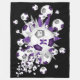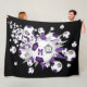 Esta manta de chica deportivo de futbol presenta una "explosión" de balones de fútbol de tamaño variado de color púrpura, gris y blanco y estrellas grises, púrpura y blancas sobre un fondo negro de personalizable - personalizar con el nombre del atleta, número de monograma y camiseta - katz_d_zynes