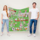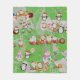 This design artwork for the New Year season is a lively and whimsical illustration filled with vibrant colors and festive characters. Dominated by a bright green background, the scene is bustling with playful figures, including multiple cheerful Santa Clauses, adorable elves, and charming penguins.