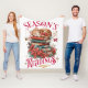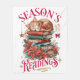 A festive and cheerful Christmas holiday design showcases an adorable kitten curled up on a large stack of books, accompanied by vibrant poinsettias. The scene is surrounded by hearts and stars, while the colorful text reads, "Season's readings." This delightful design is available on a variety of products, making it the perfect gift for book enthusiasts.