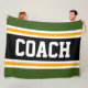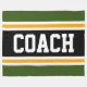 Este diseño deportivo y atlético presenta texto en negrita COACH dentro de una franja negra ancha resaltada con dos bandas de carreras blancas y amarillas contra rayas exteriores verdes del bosque. El texto se puede personalizar.
