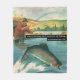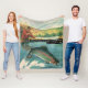 Imagen vintage de un hombre que vuela pescando en un lago y enganchando un pez grande. Una manta divertida para personalizar con el nombre de tu lago favorito para pescar. Siempre deseando un buen día de pesca. Un colorido regalo con temática de pesca para alguien que ama pescar.
