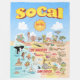 Luminosa y feliz escena - un mapa personalizado vista del sur de California - encantadores personajes disfrutan del cálido sol de SoCal - Los Ángeles, San Diego, Anaheim, Santa Bárbara, Riverside, Palm Springs y El Centro están incluidos - Parque Estatal del Desierto de Anza Borrego y Parque Nacional Joshua Tree, así como las ciudades fronterizas de Tijuana, Tecate y Calexico en México.