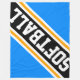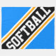 Este diseño deportivo presenta texto deportivo SOFTBALL dentro de bandas de carreras anchas diagonales en negro, blanco y amarillo dorado contra fondo azul brillante. Las letras primera y última de la palabra "softball" salen de los bordes de diseño con un efecto de banner dinámico.