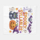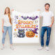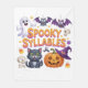 A festive Halloween-themed illustration featuring the phrase "SPOOKY SYLLABLES" in large, orange and purple gradient letters. Surrounding the text are various cartoon characters and objects: a cheerful white ghost, two hanging happy bats, an adorable black cat, a smiling jack-o'-lantern with a carved face and a purple witch hat on top, skulls, bones, and candy corn pieces. The background is dark with scattered star sparkles.