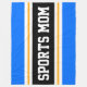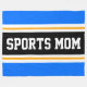 Este diseño deportivo, atlético, presenta texto en negrita SPORTS MOM dentro de una banda negra ancha resaltada con doble franjas de carreras blancas y amarillas contra rayas externas. El texto de este diseño se puede personalizar.