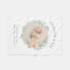 Una hermosa manta de bebé de keepsake con una corona floral de acuarela botánica en tonos verde y melocotón. Personalice el diseño con la foto del bebé, el monograma del nombre, las estadísticas de cumpleaños y nacimiento u otro texto personalizado. Utilice las herramientas de diseño para agregar más fotos, cambiar fuentes de texto y colores para crear un diseño único de un tipo. ¡Las mantas de estado de parto de los personalizados hacen un gran regalo para los nuevos padres!